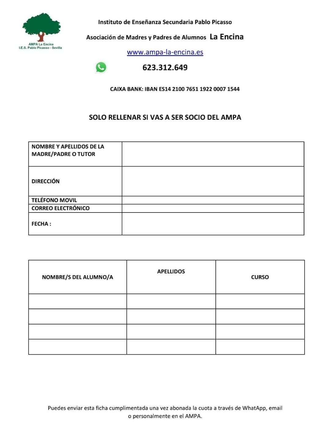 Al hacerse socio, entrará en un grupo de DIFUSION WhatsApp que irá recibiendo mensajes. Deberá de guardar en sus contactos el teléfono móvil de AMPA 623 31 26 49.